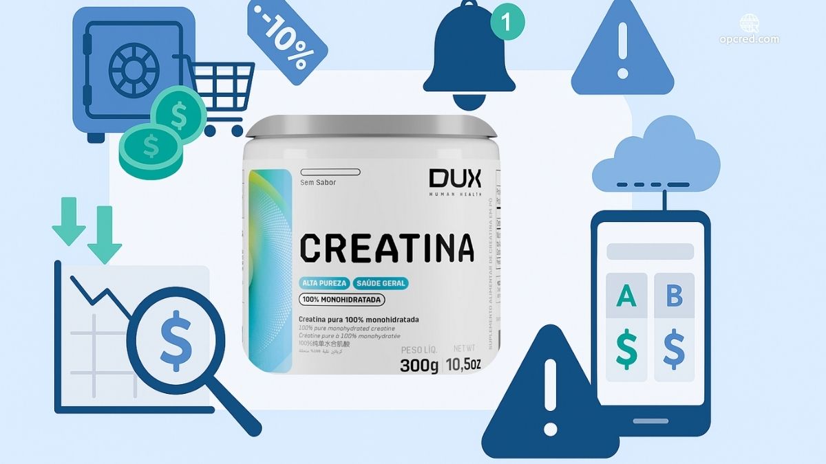 A Creatina DUX se destaca pelo ótimo custo-benefício, já que o pote de 300g rende bastante e possui alta pureza. Porém, como o preço pode variar bastante entre lojas, ativar o alerta é a melhor estratégia.
