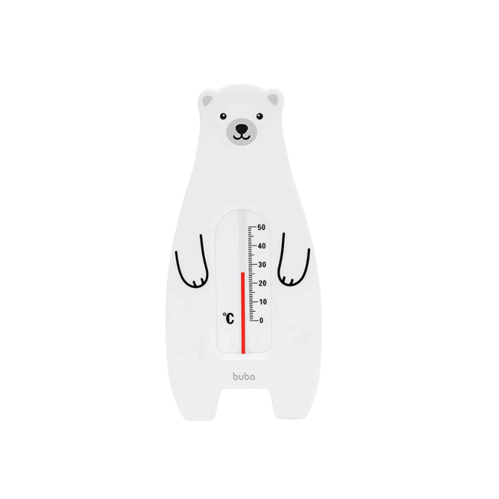 Outro modelo da Buba, este termômetro em formato de urso é perfeito para medir a temperatura da água do banho de bebês, com escala de 10°C a 40°C. Seu design flutuante e material resistente garantem durabilidade e segurança.